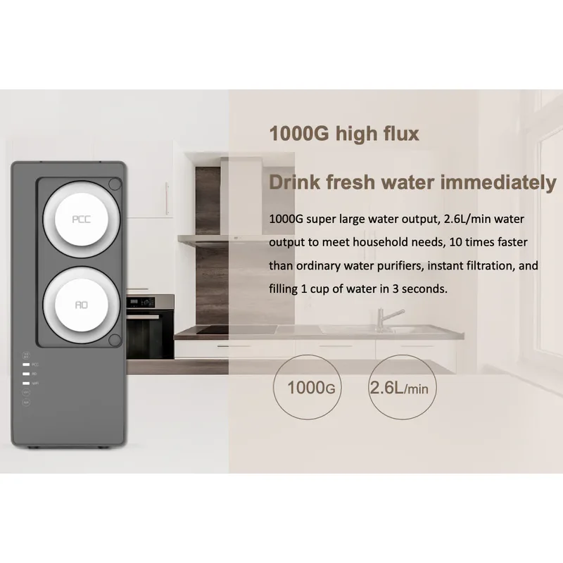 - Tiesioginis 1000G srautas: iki 2.6 l/min be bako – vanduo tiekiamas realiu laiku.